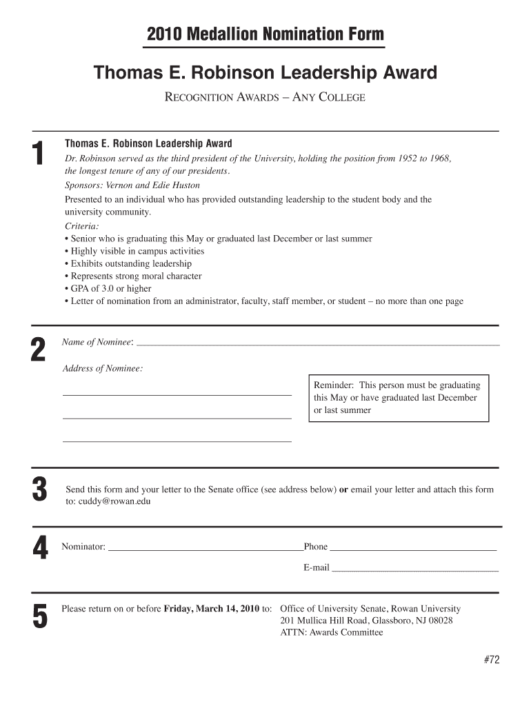 A nomination form for the Thomas E. Robinson Leadership Award, recognizing outstanding leadership among students at a university.