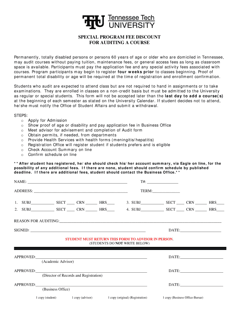 Get the free SPECIAL PROGRAM FEE DISCOUNT FOR AUDITING A COURSE - tntech
