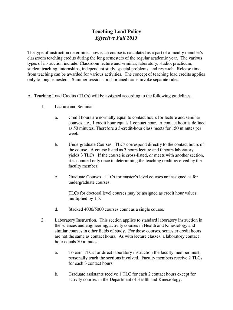 This policy outlines the guidelines for assigning teaching load credits (TLCs) for faculty members based on the type of instruction and various teaching activities during the academic year.