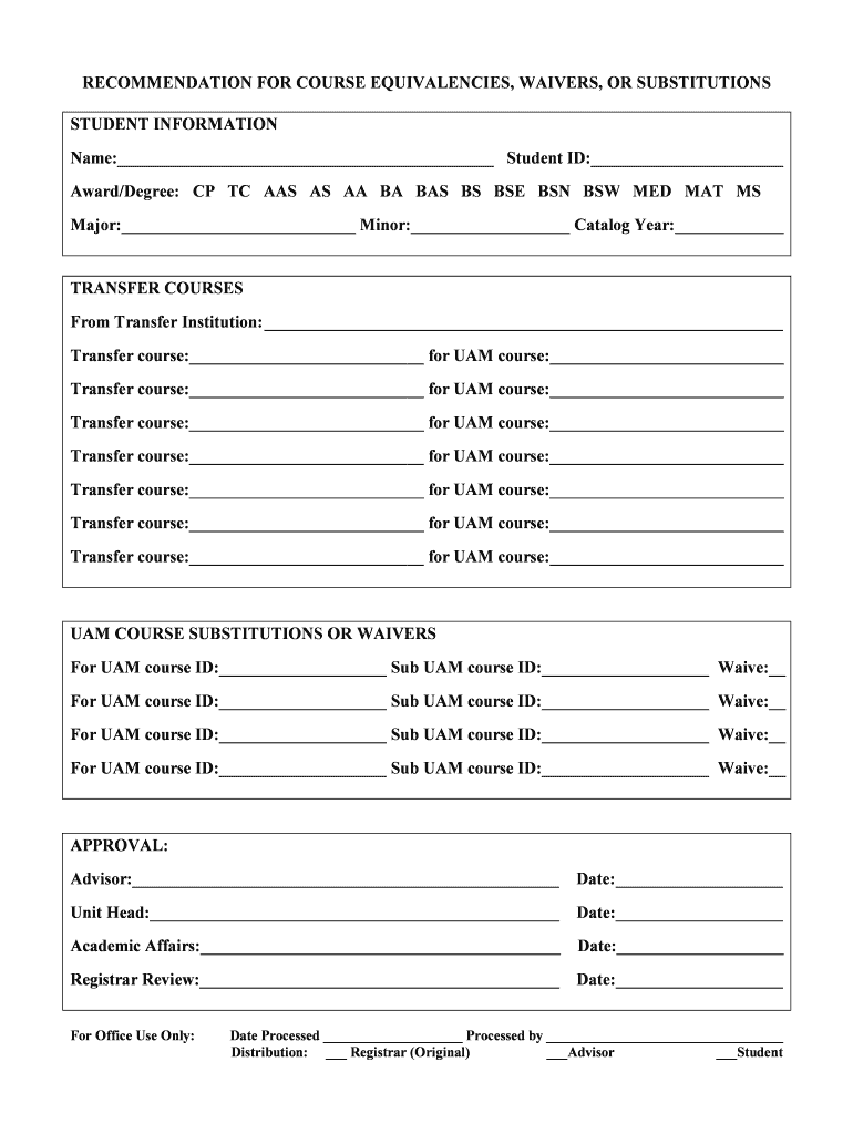 Common scenarios requiring the form include transferring credits from a different college or university, or when a student wants to request a course substitution for a core requirement at UAM.