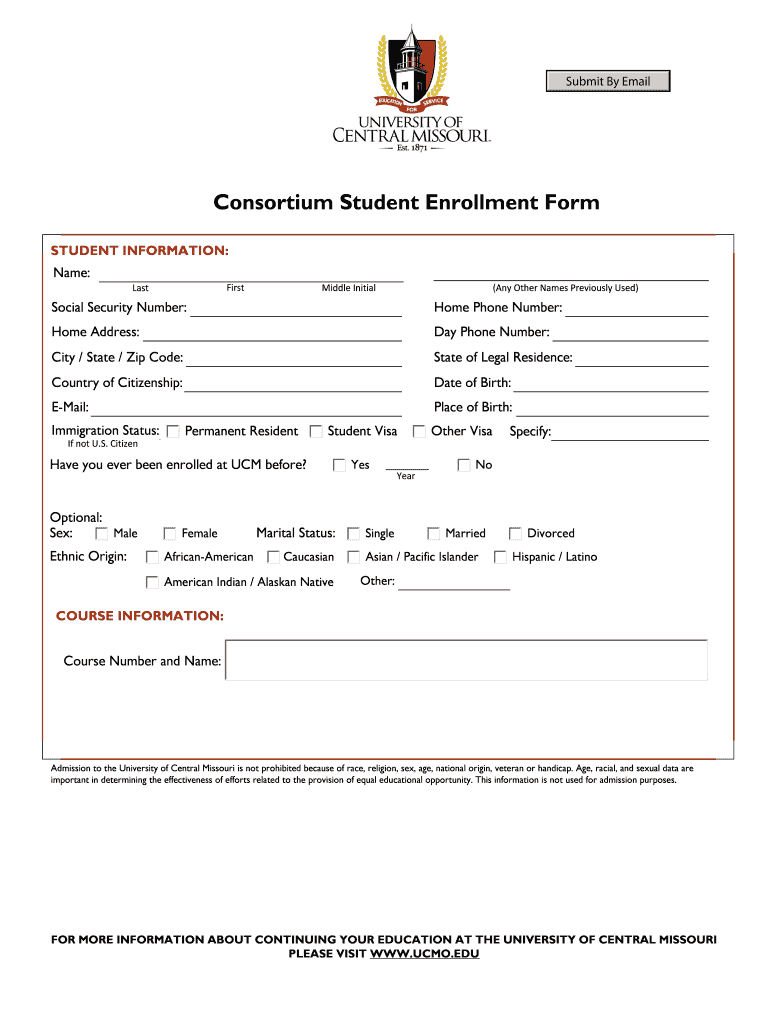 The Consortium Student Enrollment Form is a school enrollment document used by the University of Central Missouri to collect student information for enrollment purposes.
