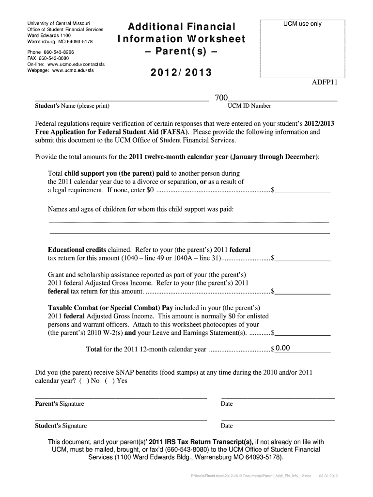 The UCM Additional Financial Information Form is a financial aid application used by the University of Central Missouri to verify financial details required for student financial aid.