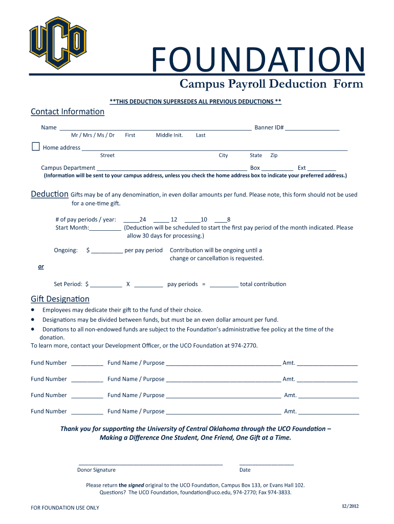 The Campus Payroll Deduction Form is a personal finance document used by employees of the University of Central Oklahoma to make ongoing donations to the UCO Foundation.
