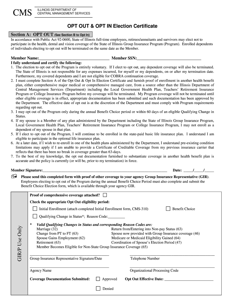 The Illinois Opt Out & Opt In Election Certificate is a government form used by employees and retirees in Illinois to elect not to participate in or opt back into the State of Illinois Group Insurance Program.