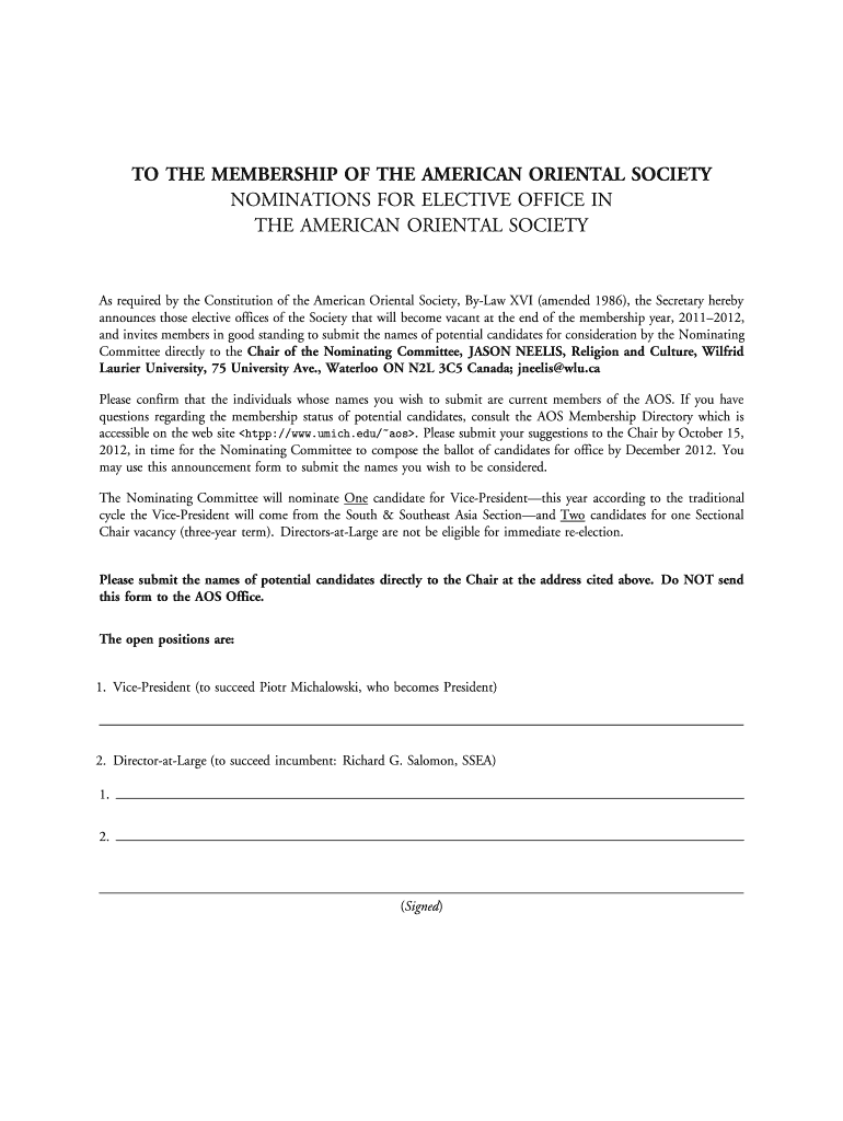 How to fill out Nominations for Elective Office in the American Oriental Society