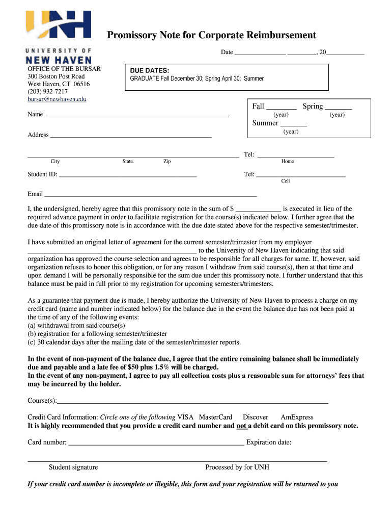 Get the free Promissory Note for Corporate Reimbursement - newhaven