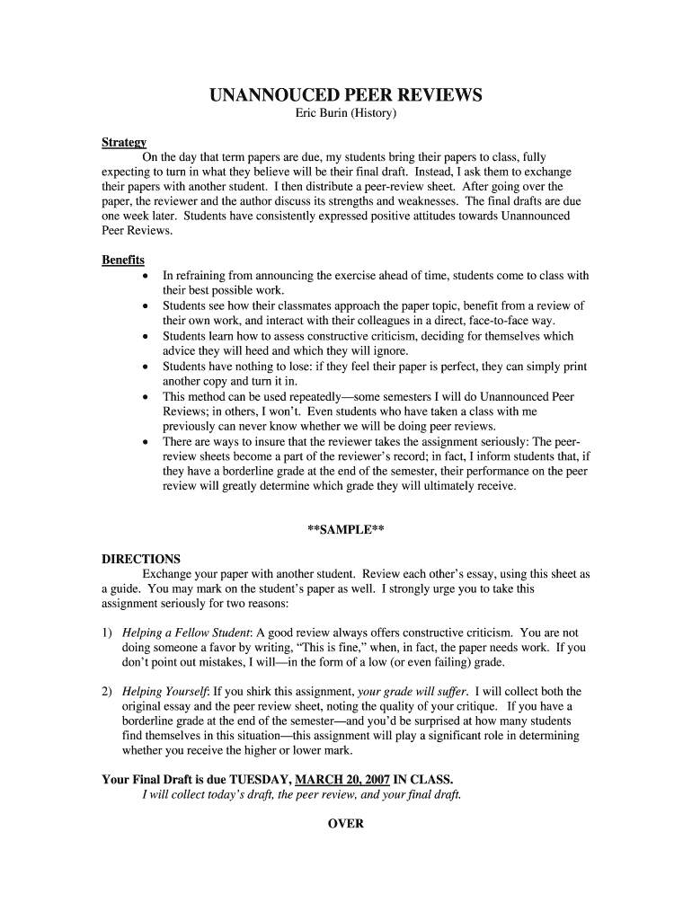 The Unannounced Peer Reviews Form is a peer review document used by educators to facilitate constructive feedback on student essays.