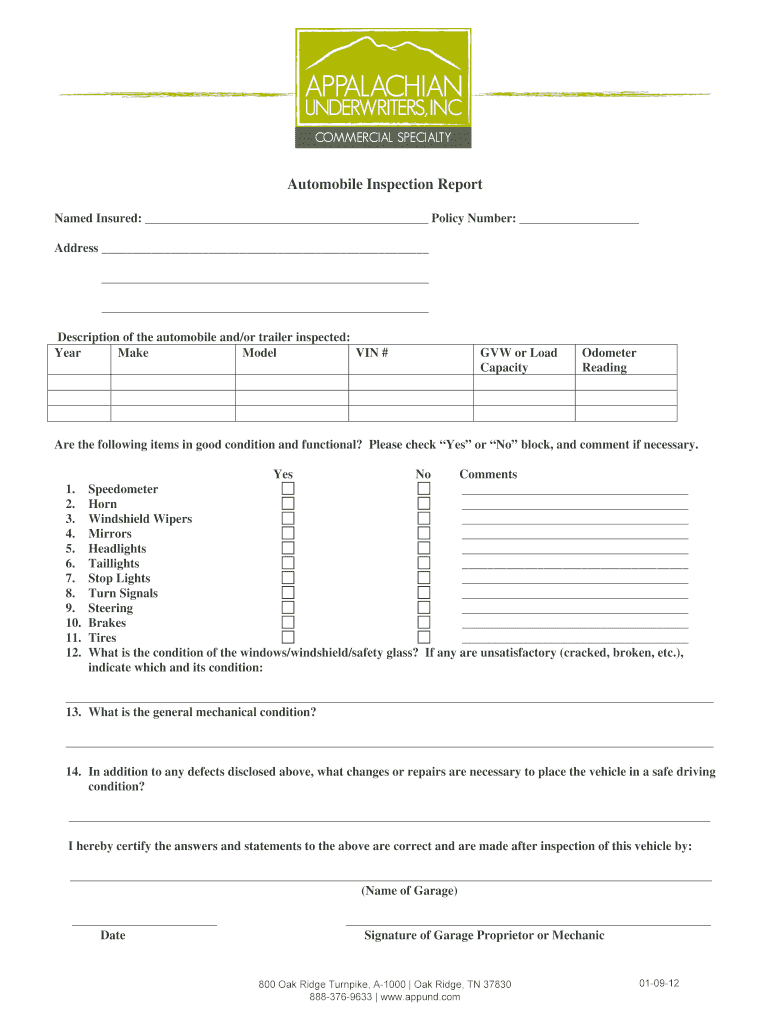 An Automobile Inspection Report is a document that details the condition of a vehicle after it has undergone a thorough inspection, usually conducted by a certified mechanic or technician.