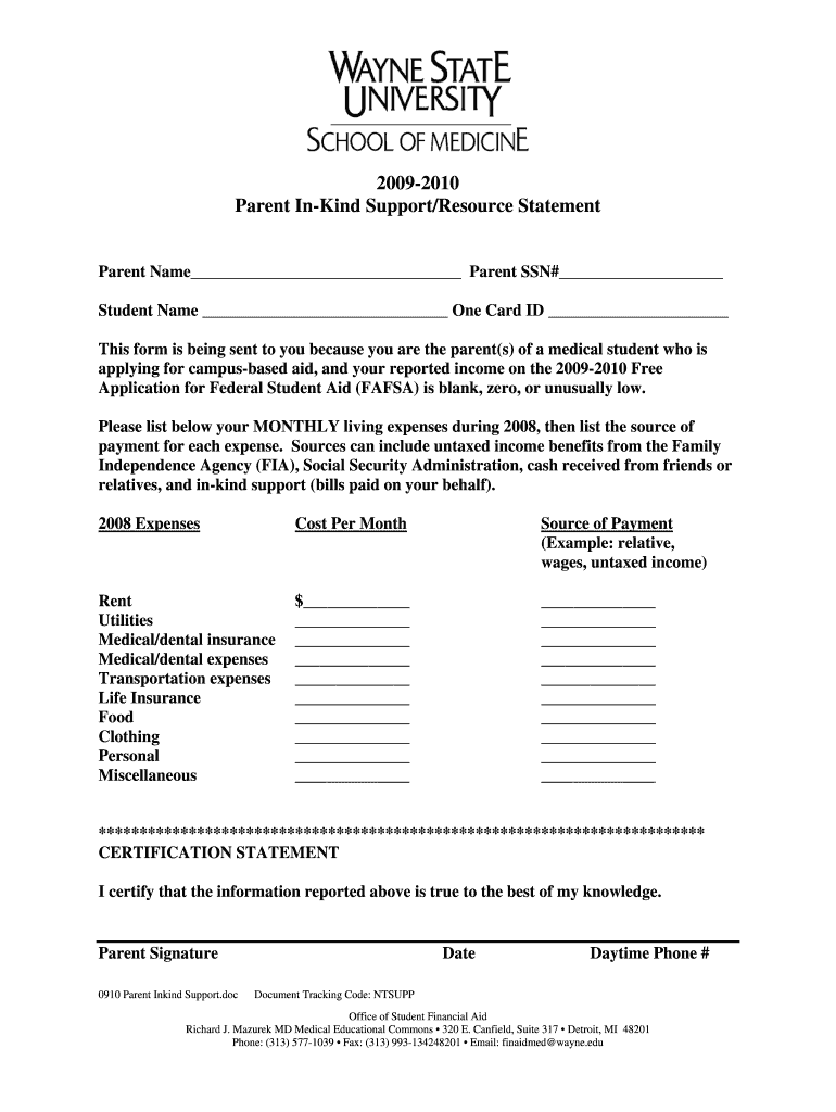 Get the free 2009-2010 Parent In-Kind Support/Resource Statement - med wayne