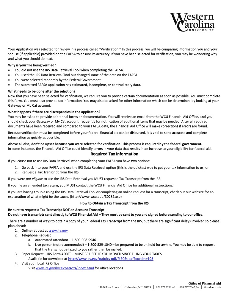 Your Application was selected for review in a process called Verification. In this process, we will be comparing information you and your spouse (if applicable) provided on the FAFSA to ensure its