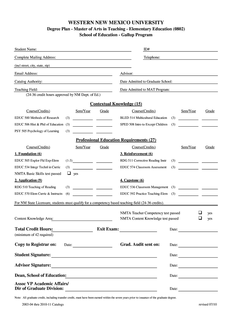 Get the free MAT Elementary Education (Gallup) thru 2010 - Western New ... - wnmu