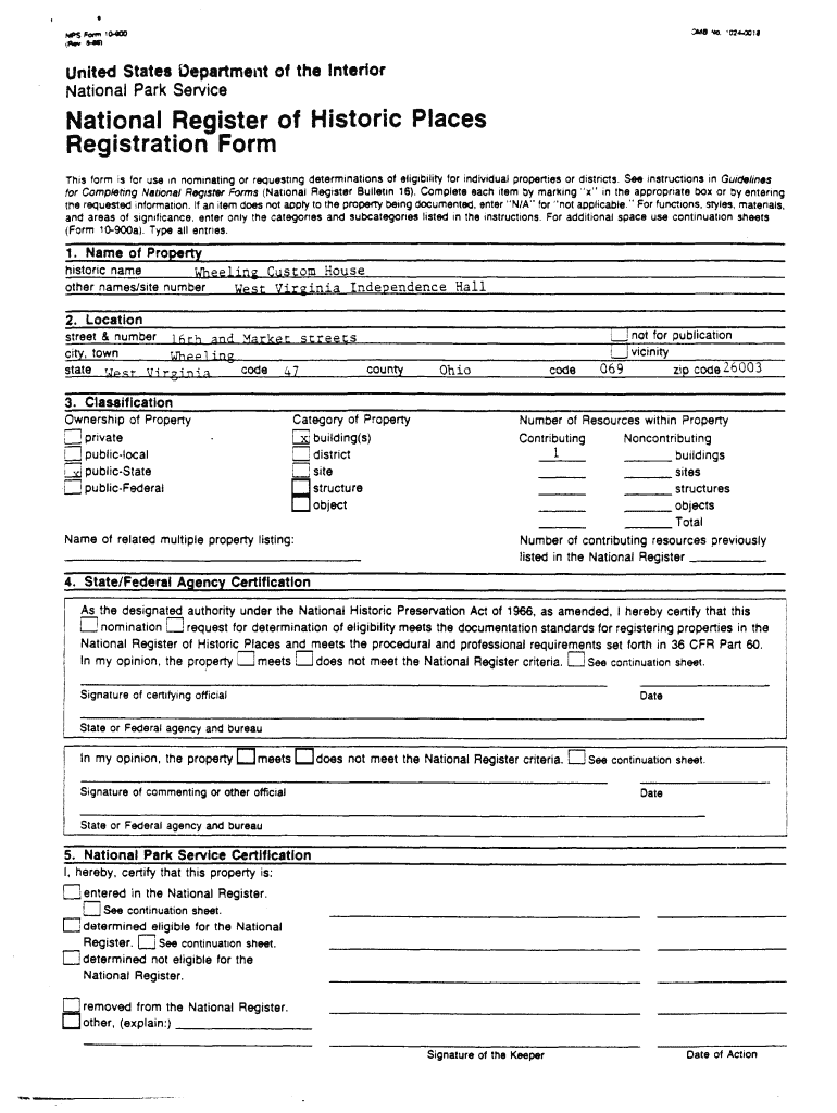 This document is a registration form for the Wheeling Custom House to be listed in the National Register of Historic Places. It outlines the property's historical significance, architectural details,
