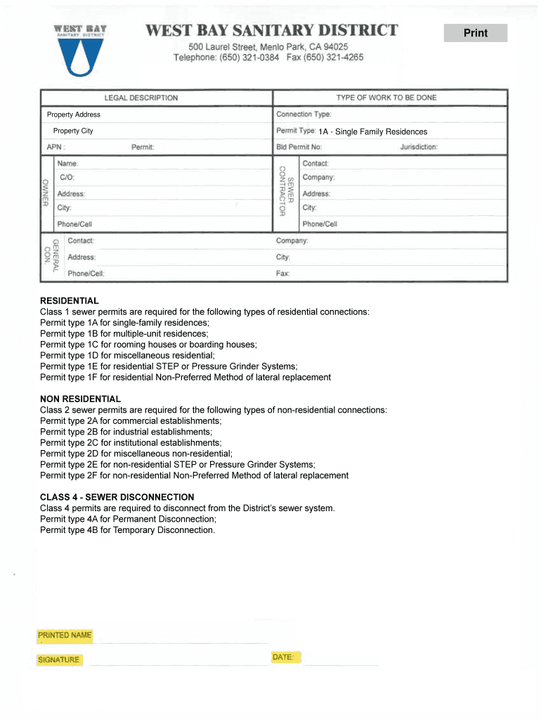 Print Property Address Property City 1A Single Family Residences RESIDENTIAL Class 1 sewer permits are required for the following types of residential connections: Permit type 1A for single-family