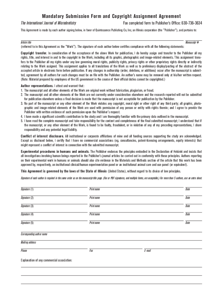 The Copyright Assignment Agreement is a legal document used by authors to transfer copyright ownership to Quintessence Publishing Co, Inc.