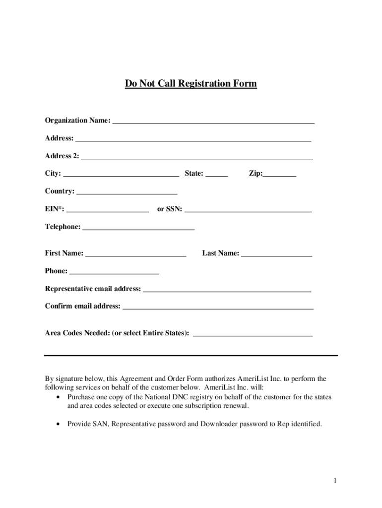 This form is used to register for access to the National Do Not Call Registry and authorize AmeriList Inc. to perform related services.