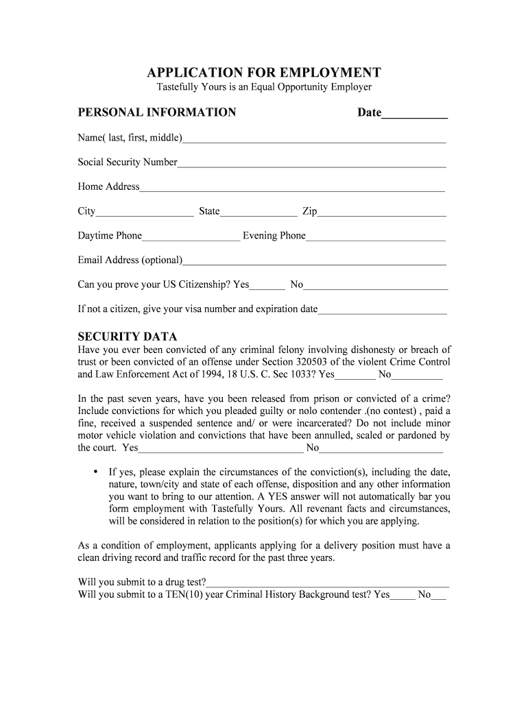This document is an application form for employment at Tastefully Yours, an Equal Opportunity Employer, collecting personal, educational, and work history information from job applicants.