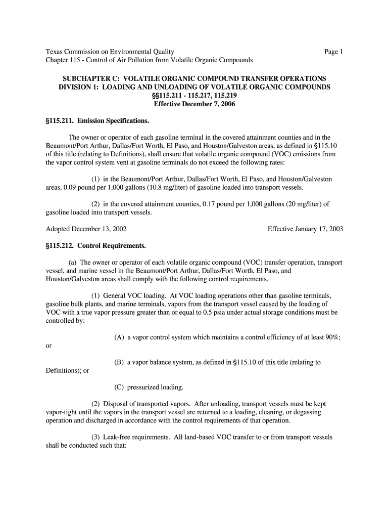 Texas Commission on Environmental Quality Chapter 115 Control of Air Pollution from Volatile Organic Compounds Page 1 SUBCHAPTER C: VOLATILE ORGANIC COMPOUND TRANSFER OPERATIONS DIVISION 1: LOADING