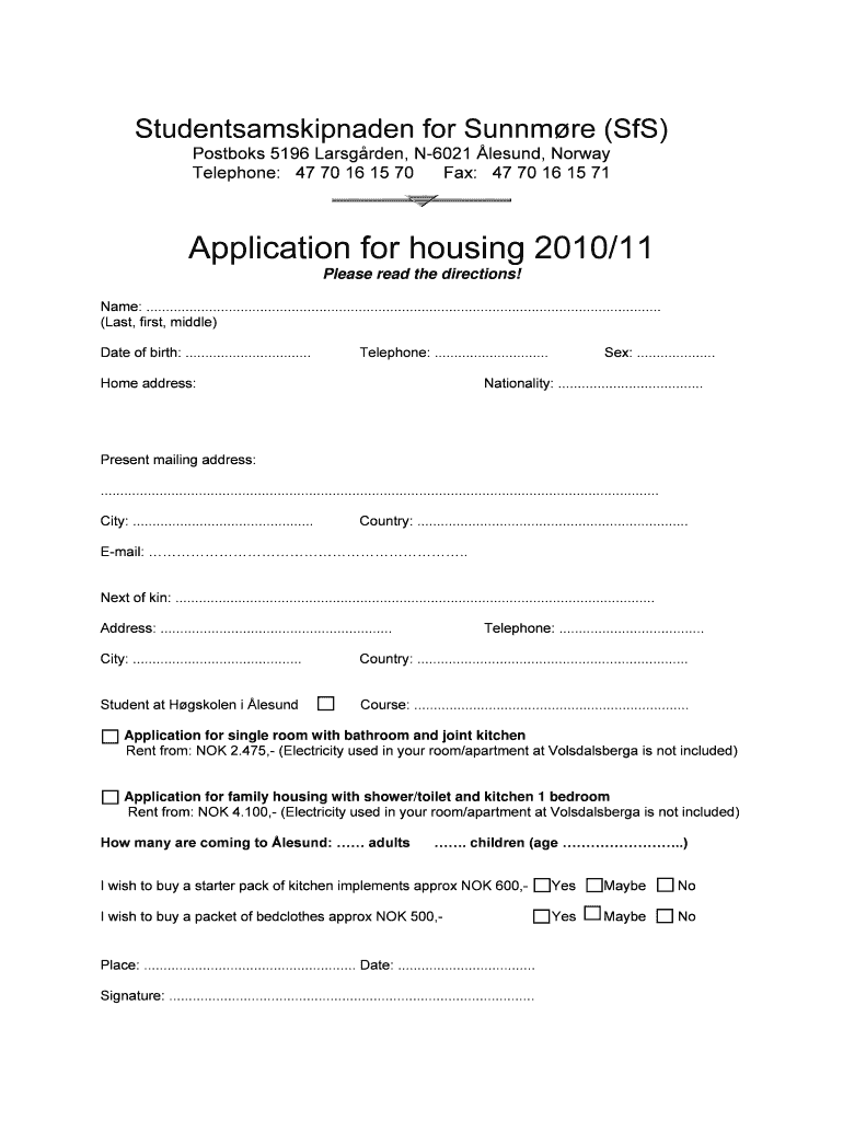Studentsamskipnaden for Sunny re (SFS) Postdocs 5196 Lars den, N-6021 legend, Norway Telephone: 47 70 16 15 70 Fax: 47 70 16 15 71 Application for housing 2010/11 Please read the directions! Name: