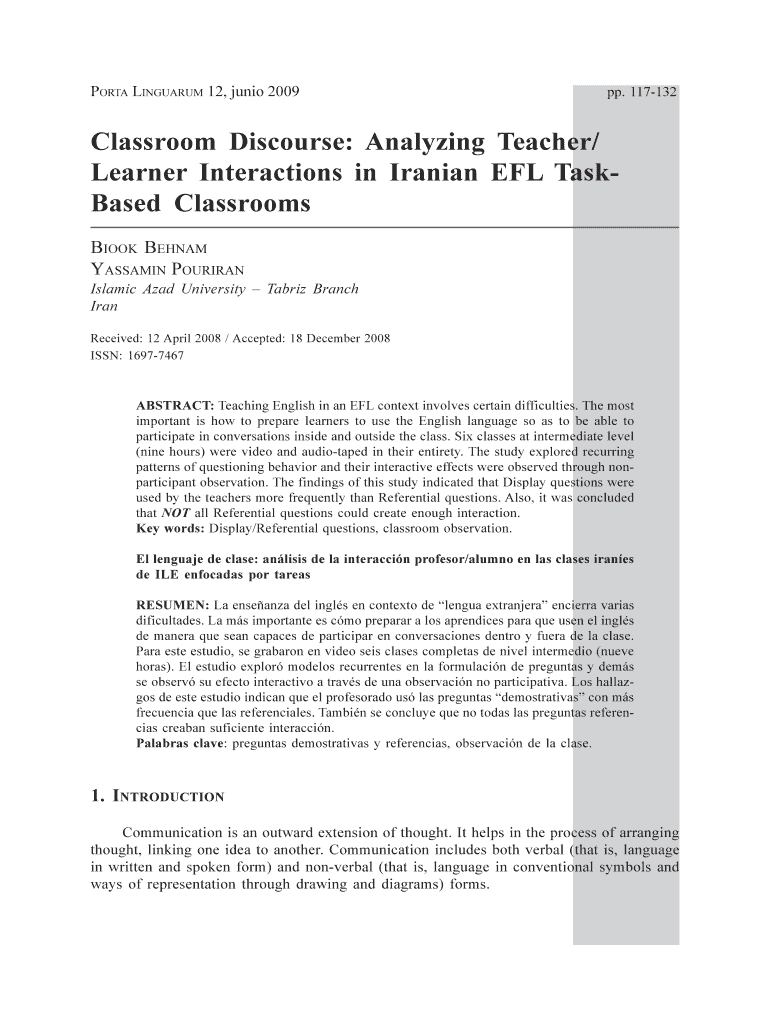 AORTA P EDUARDO LINGUAL CONSTANZA 12, junior 2009Towards the development of a global communicative pp. 117132 ... Classroom Discourse: Analyzing Teacher/ Learner Interactions in Iranian EFL Tasked