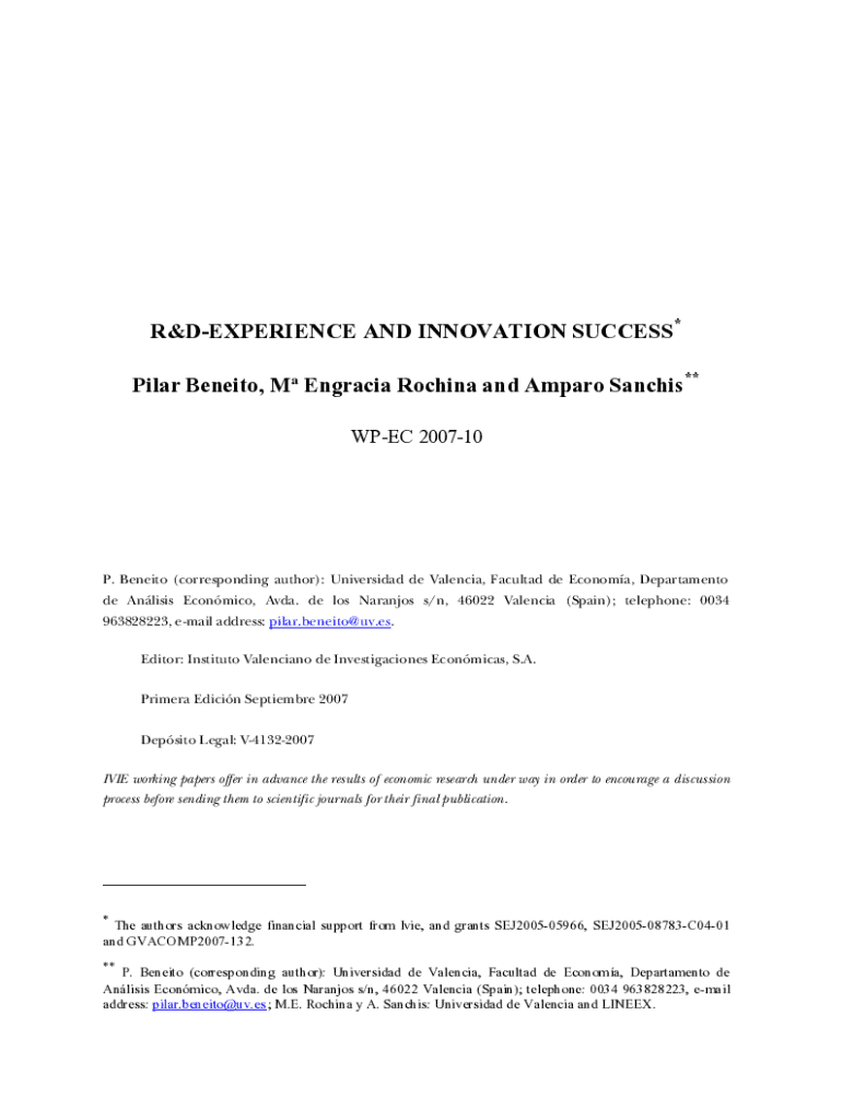 EXPERIENCE AND INNOVATION SUCCESS* Polar Benito, M Engrain China and Amparo San chis ** SPEC 200710P. Benito (corresponding author): Universidad de Valencia, Facultad de Economa, Department de Anlisis