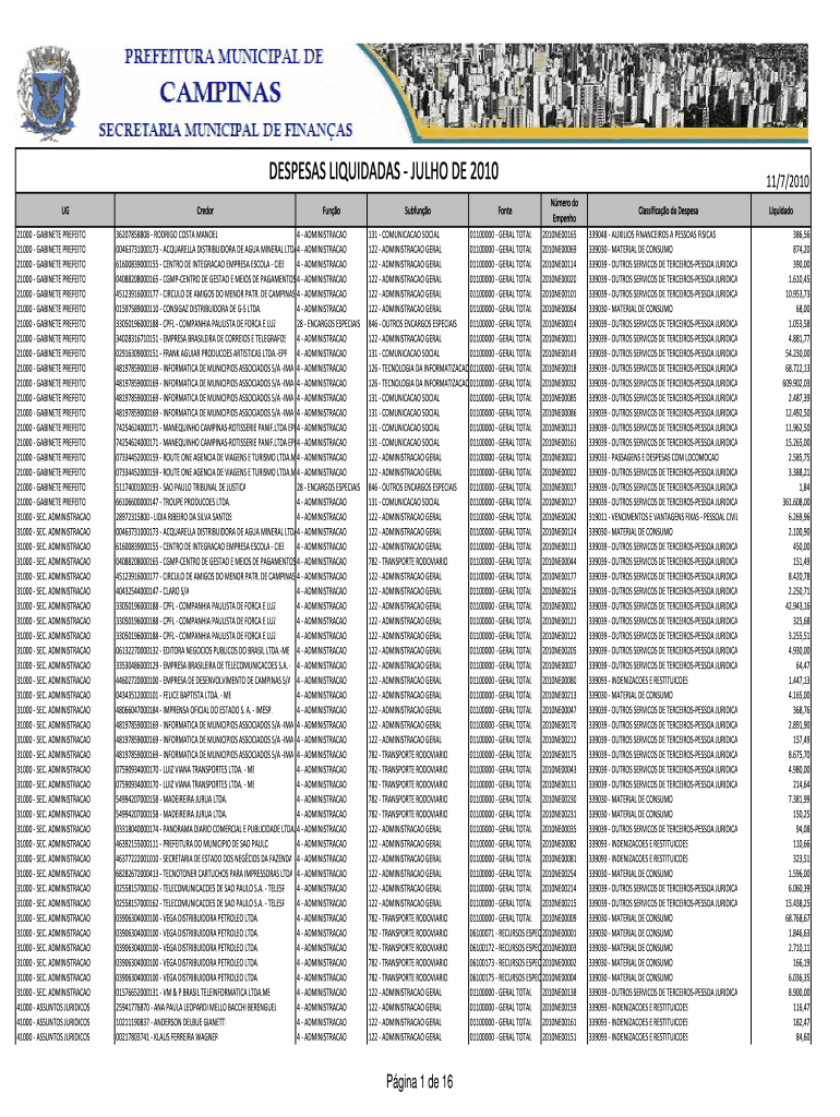 Documento que apresenta as despesas liquidavas do Gabinete do Prefeito e outras secretarias para o mês de julho de 2010, incluindo detalhes de credores, funções e fontes das despesas.
