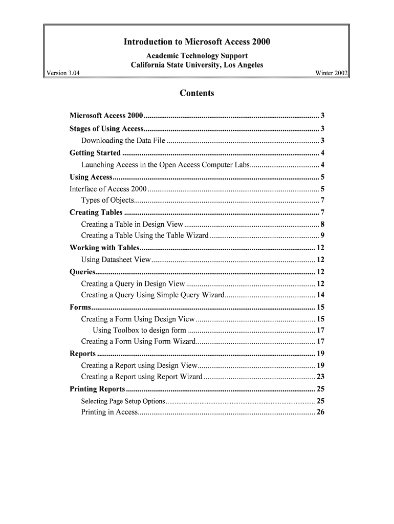 Introduction to Microsoft Access 2000 Academic Technology Support California State University, Los Angeles Version 3.04 Winter 2002 Contents Microsoft Access 2000...........................................................................................