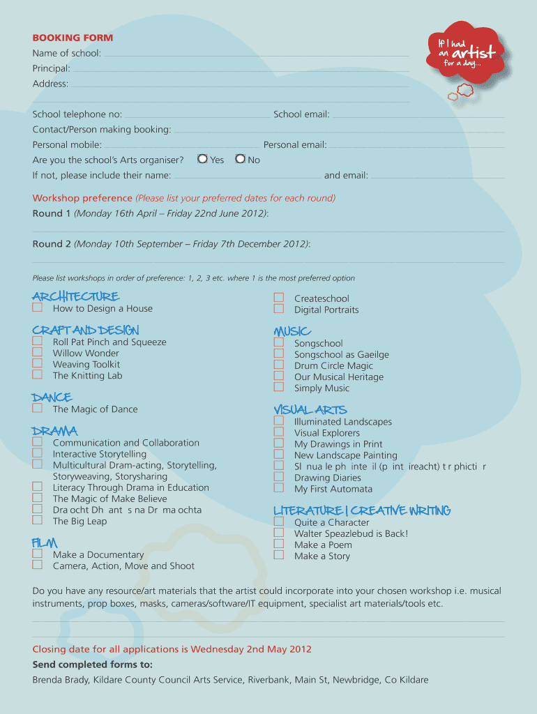 This document is a booking form for schools to apply for workshops in various artistic fields, including architecture, craft, dance, drama, film, music, visual arts, and creative writing. It collects