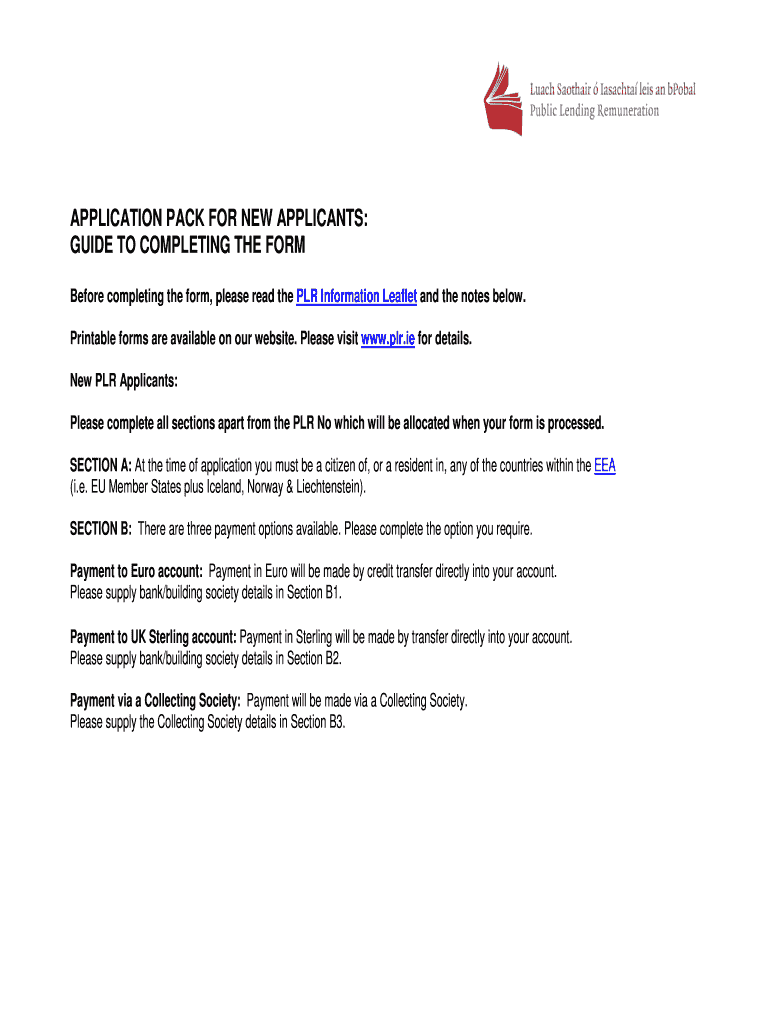 The PLR Application Form is a document used by new applicants to register for the Public Lending Right (PLR) in Ireland.