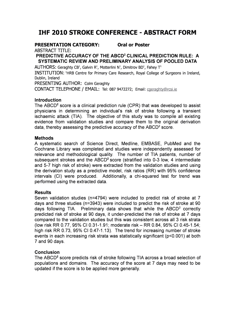 Get the free Ihf 2010 stroke conference - abstract form - The HRB Centre for ... - hrbcentreprima...