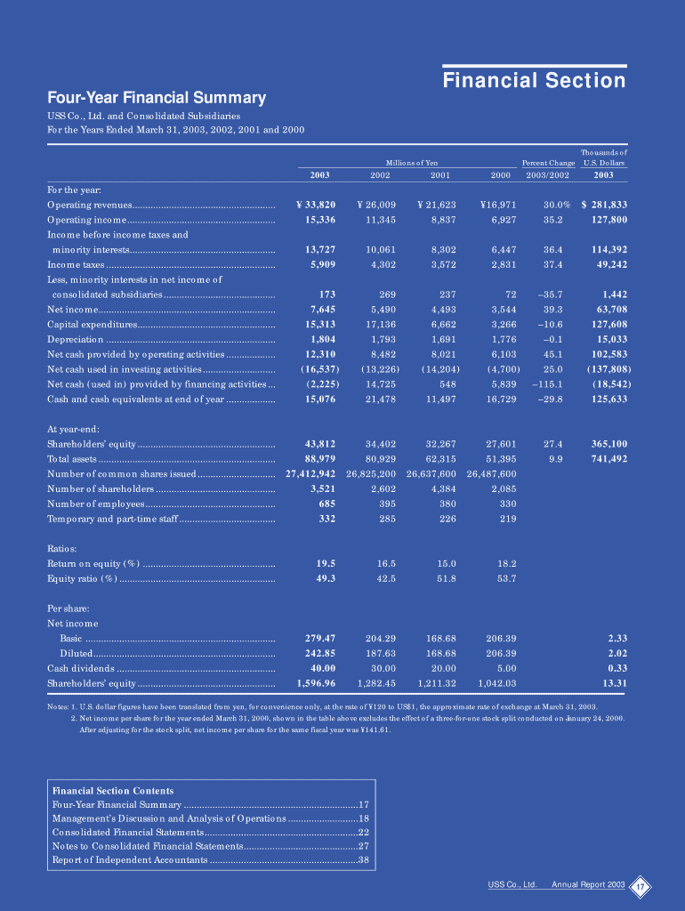 Financial Section Four-Year Financial Summary USS Co., Ltd. and Consolidated Subsidiaries For the Years Ended March 31, 2003, 2002, 2001 and 2000 Percent Change Millions of Yen 2003 For the year: