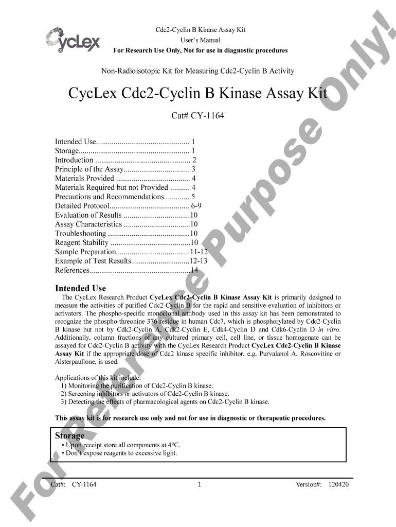 On Non-Radioisotopic Kit for Measuring Cdc2-Cyclin B Activity LY ! Cdc2-Cyclin B Kinase Assay Kit User s Manual For Research Use Only, Not for use in diagnostic procedures Cycle Cdc2-Cyclin B Kinase