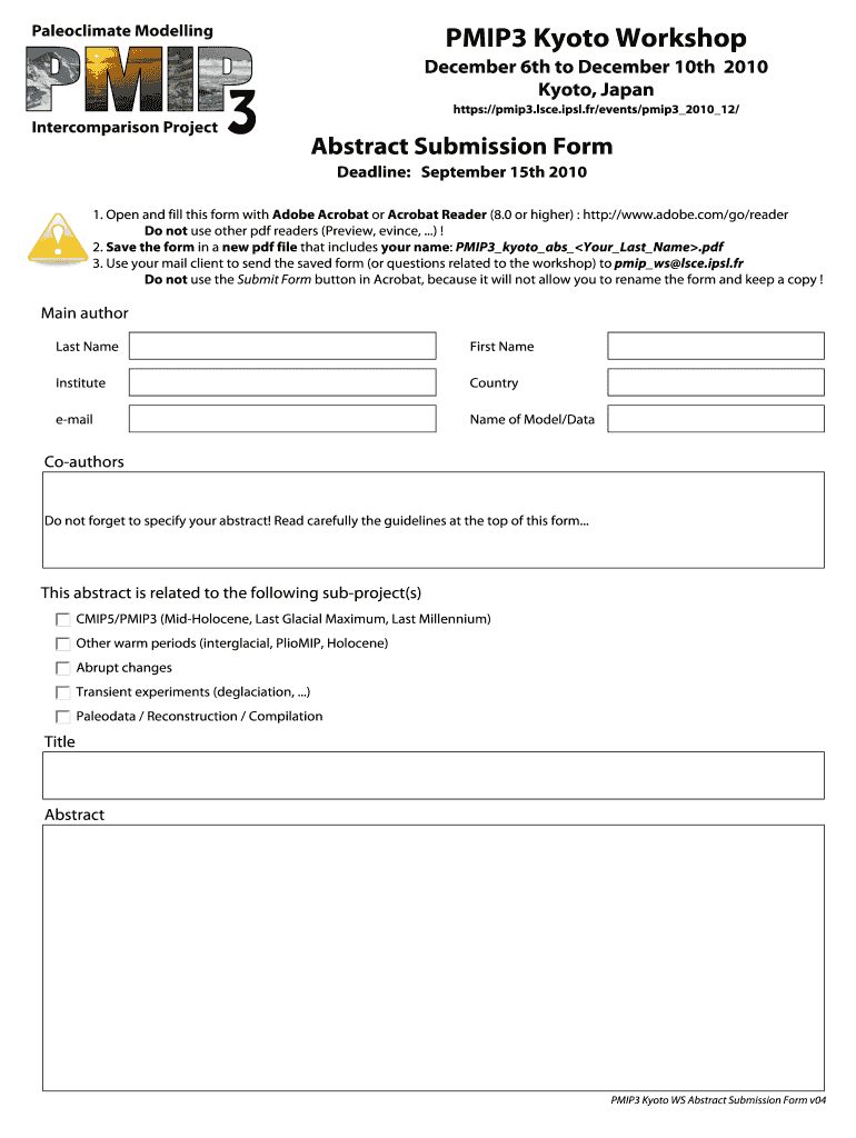PMIP3 Kyoto Workshop December 6th to December 10th 2010 Kyoto, Japan https://pmip3.lsce.ipsl.fr/events/pmip3 2010 12/ Abstract Submission Form Deadline: September 15th 2010 1. Open and fill this form