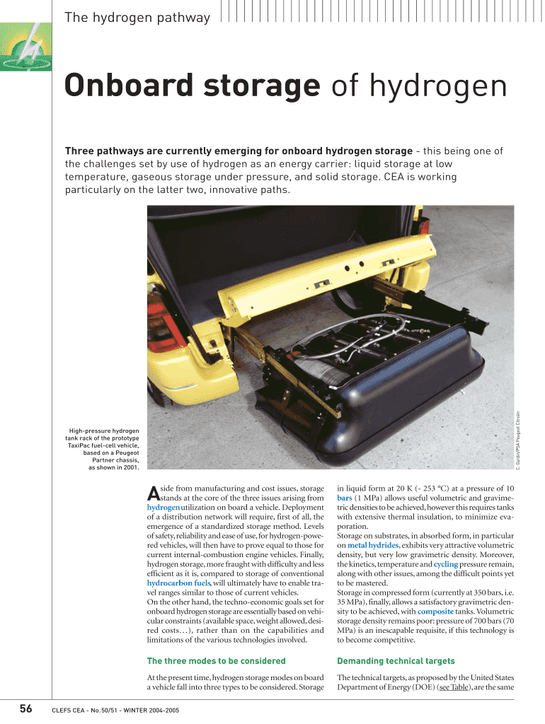 The hydrogen pathway Onboard storage of hydrogen C. Garden/PSA Peugeot Citron Three pathways are currently emerging for onboard hydrogen storage this being one of the challenges set by use of hydrogen