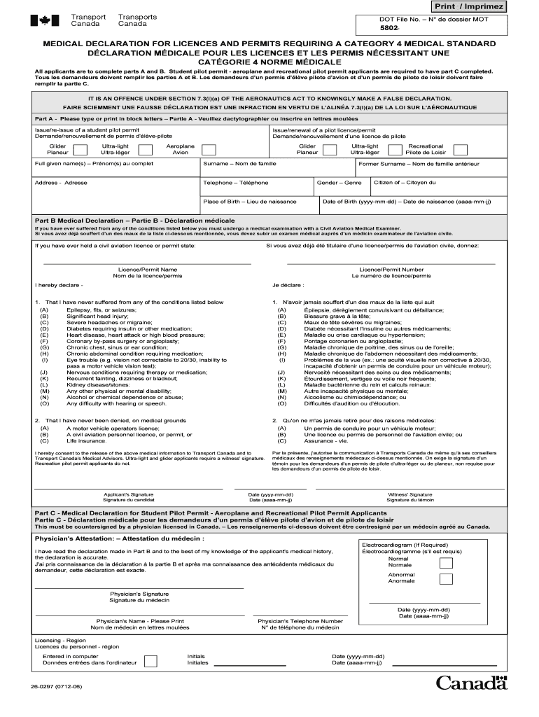The Medical Declaration for Licences and Permits is a government document used by individuals in Canada to declare their medical history when applying for or renewing pilot licences and permits.