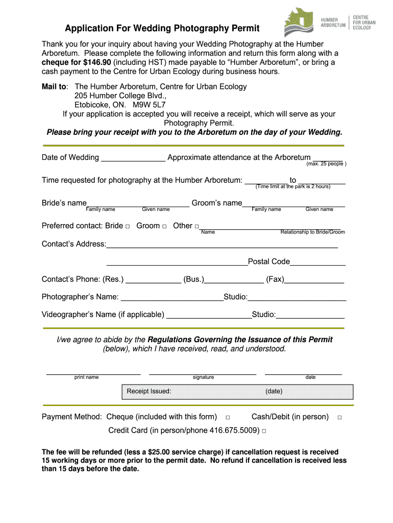 Humber Arboretum Application For Wedding Photography Permit free printable template
