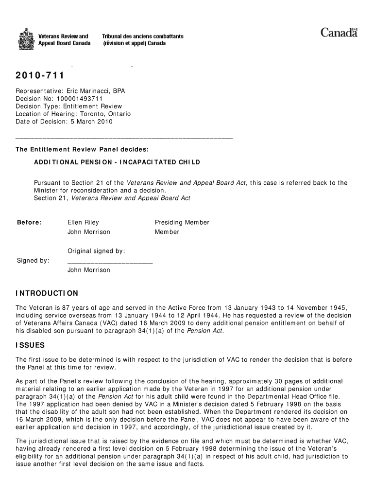 This document outlines the decision by the Veterans Review and Appeal Board regarding an additional pension entitlement for an incapacitated child of a veteran, including legal analysis, evidence