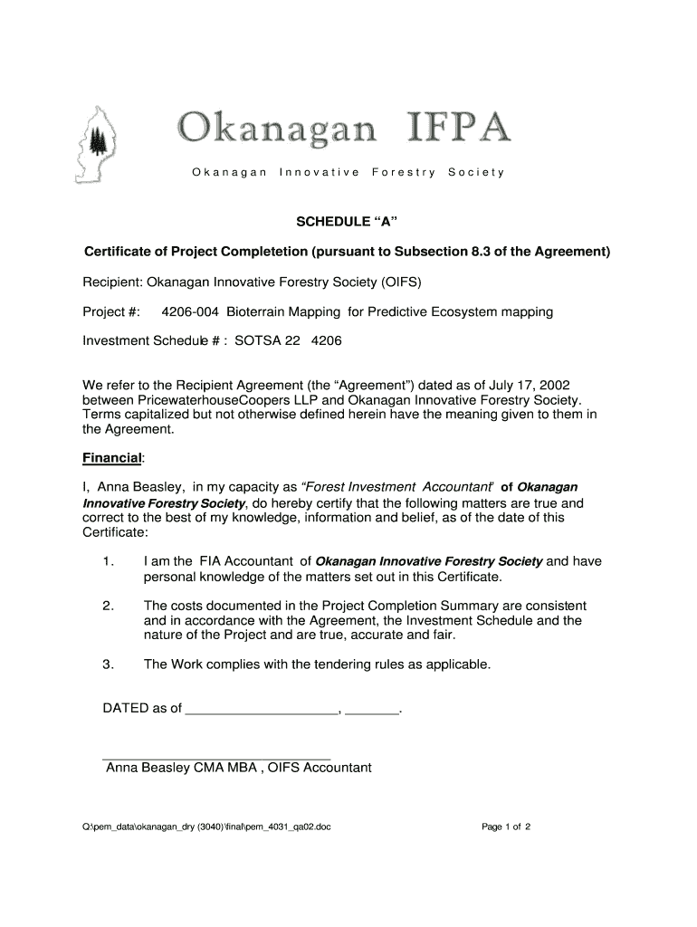 Get the free Certificate of Project Completion - a100 gov bc