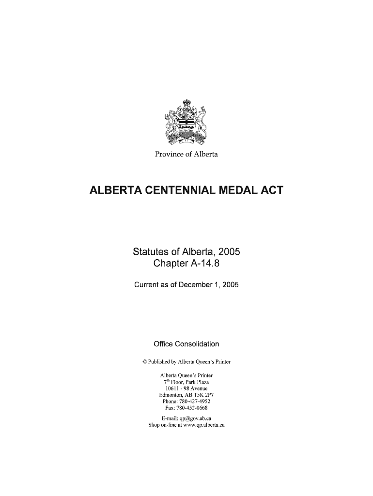 Province of Alberta CENTENNIAL MEDAL ACT Statutes of Alberta, 2005 Chapter A14.8 Current as of December 1, 2005, Office Consolidation Published by Alberta Queens Printer Alberta Queens Printer 7th