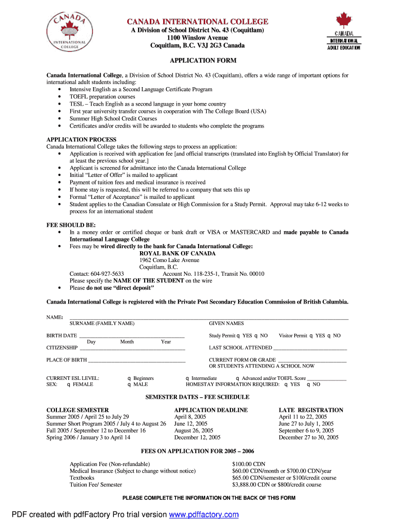 This document is an application form for international adult students wishing to enroll at Canada International College, offering various programs including ESL, TOEFL preparation, and university