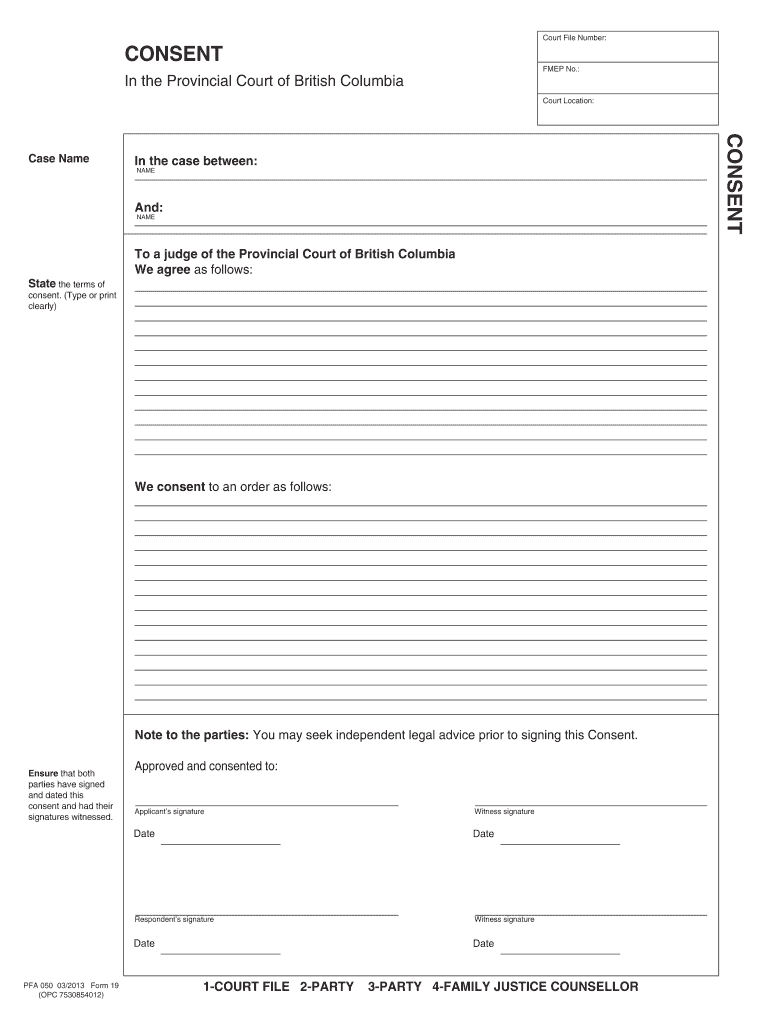 The Consent Form 19 is available for applicants, respondents, and witnesses involved in the Provincial Court of British Columbia family law cases.