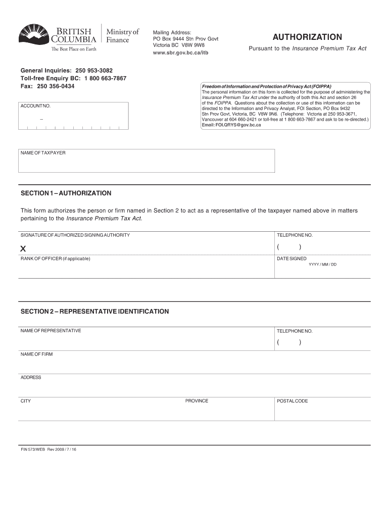 The form is designed for taxpayers in British Columbia who need to authorize a representative to handle matters related to the Insurance Premium Tax Act. Both the taxpayer and the authorized signing authority must sign the form.