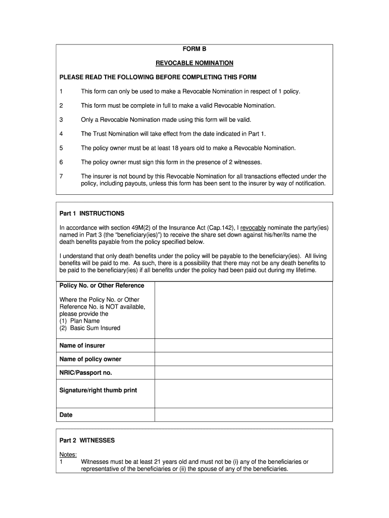 The Revocable Nomination Form is designed for policy owners in Singapore who want to nominate beneficiaries for insurance death benefits.