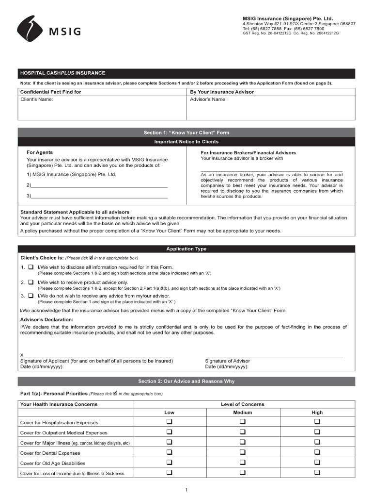 The MSIG Hospital CashPlus Insurance Application is a financial document used by individuals and businesses in Singapore to apply for hospital cash insurance coverage.
