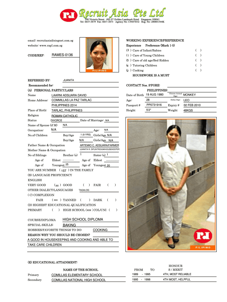 Email: recruits singnet.com.SG WORKING EXPERIENCE/PREFERENCE website: www.rapl.com.sg Experience Preference (Mark 15) (3) Care of Infant/Babies) () () (4) Tutoring Children () (2) Cooking RAMES0136