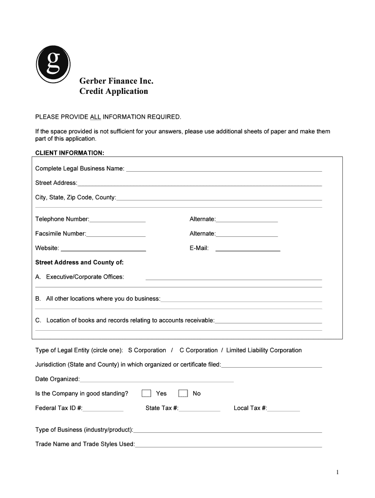 The Gerber Finance Inc. Credit Application is a business form used by companies to apply for credit financing.