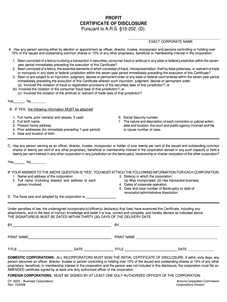 This document serves to disclose any felony convictions or legal issues concerning persons in significant corporate positions, as mandated by Arizona corporate law.