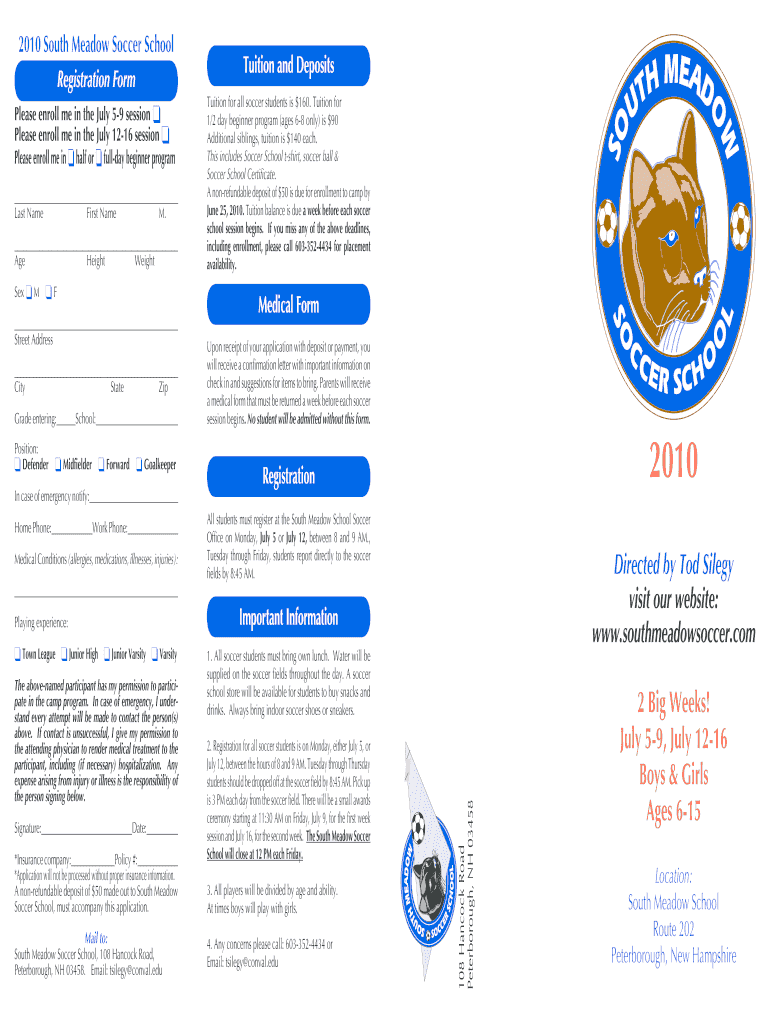 Individuals who wish to enroll their children or themselves in the South Meadow Soccer School for the 2010 season are required to file this registration form.