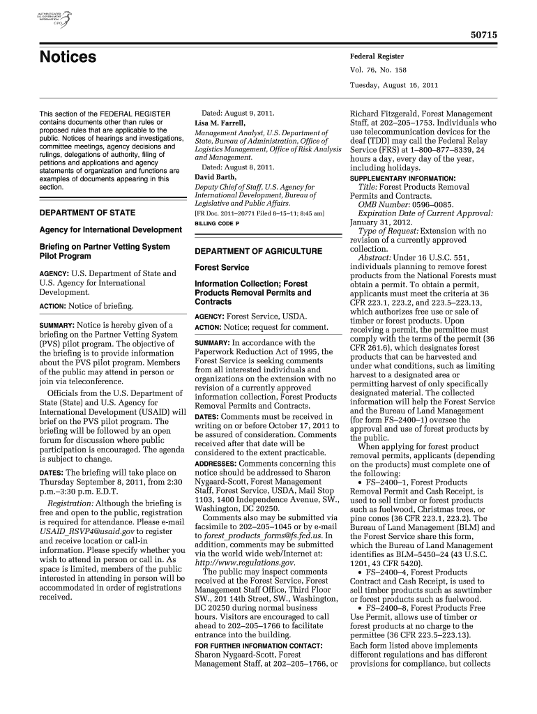 This document contains notices relevant to the public, including details about a briefing on the Partner Vetting System pilot program and information collection regarding Forest Products Removal Permits