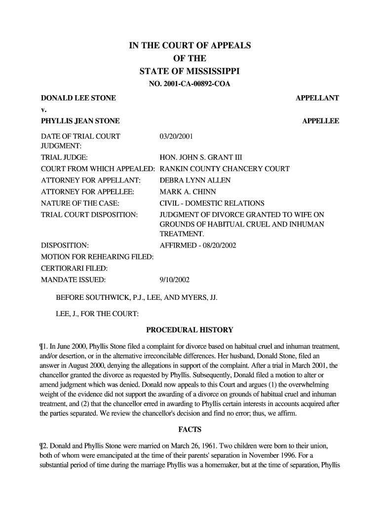 IN THE COURT OF APPEALS OF THE STATE OF MISSISSIPPI NO. 2001-CA-00892-COA DONALD LEE STONE v* PHYLLIS JEAN STONE APPELLANT APPELLEE DATE OF TRIAL COURT JUDGMENT TRIAL JUDGE COURT FROM WHICH APPEALED ATTORNEY FOR APPELLANT NATURE OF THE CASE TRIAL COURT DISPOSITION 03/20/2001 HON* JOHN S* GRANT III RANKIN COUNTY CHANCERY COURT DEBRA LYNN ALLEN MARK A. CHINN CIVIL - DOMESTIC RELATIONS JUDGMENT OF DIVORCE GRANTED TO WIFE ON GROUNDS OF HABITUAL CRUEL AND INHUMAN TREATMENT. AFFIRMED - 08/20/2002...