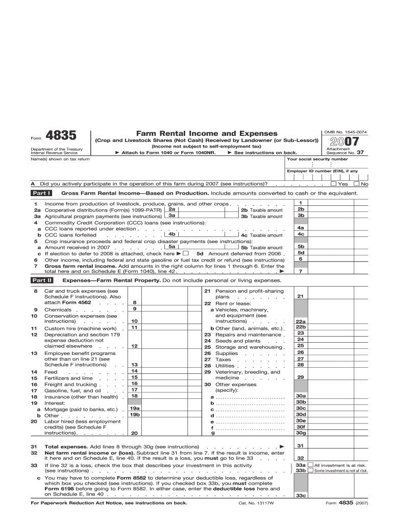 Form 4835 is generally the way for non-participating farmland owners to report their farm income and expenses (although you must use Schedule E instead of Form 4835 to report income if you simply rent your pasture or other farmland for a flat cash amount without providing services).